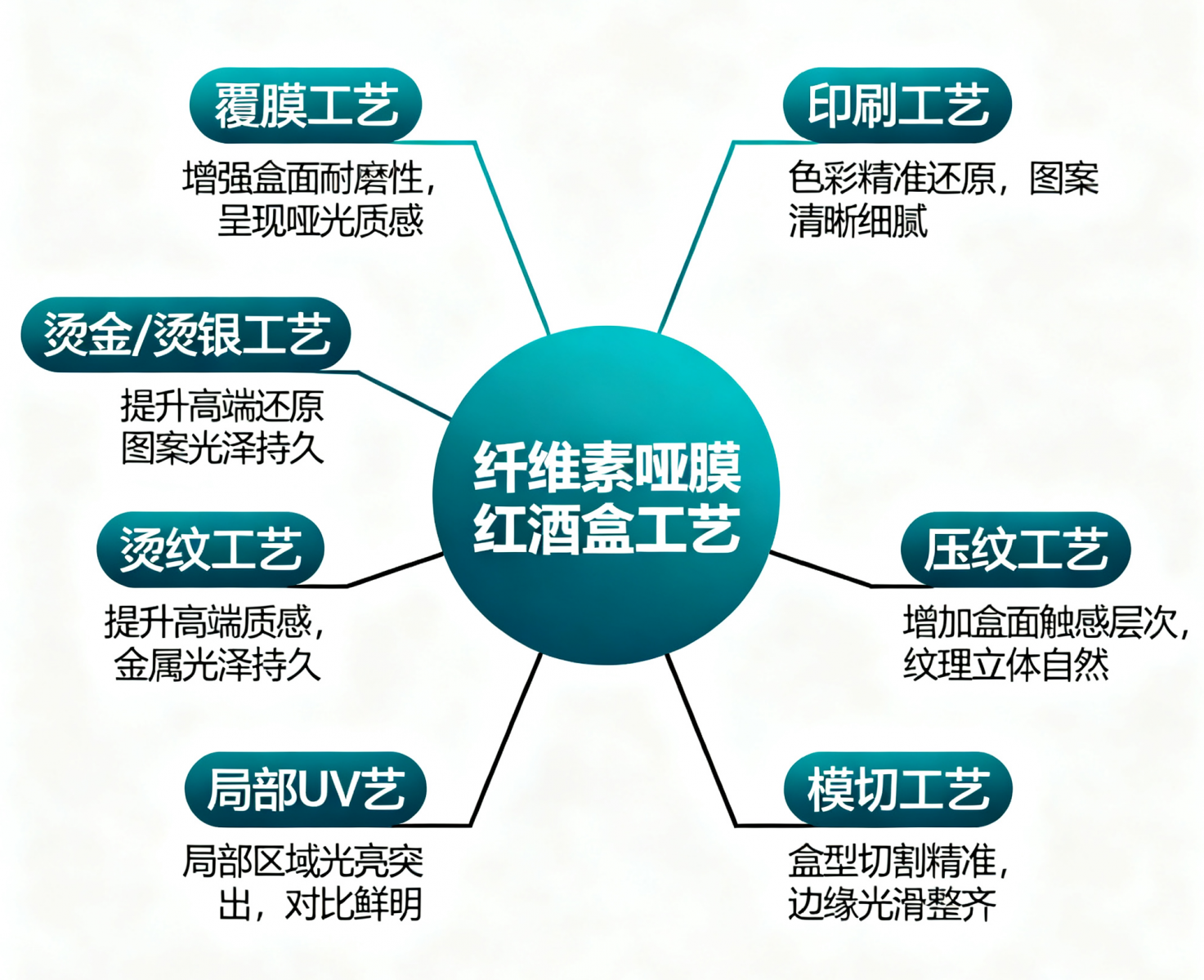 局部 UV 工藝:在纖維素啞膜表面的特定區(qū)域進行 UV 上光處理,使該區(qū)域形成光亮的效果,與啞膜的啞光部分形成鮮明對比,突出紅酒盒上的重點信息或圖案,如紅酒的品牌標識、葡萄品種等。 模