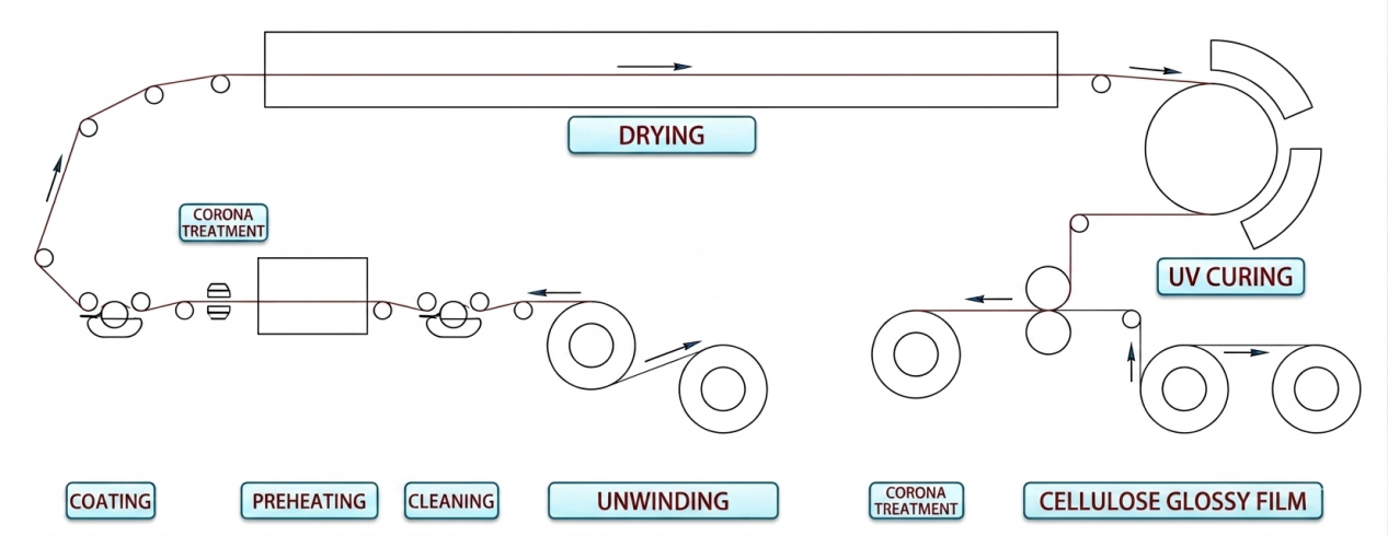 纖維素光膜→放卷→ 涂UV油 → 烘干 → UV燈固化 → 收卷